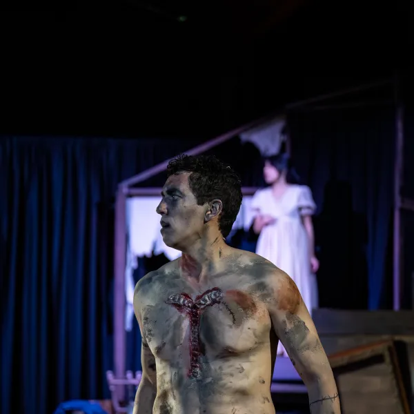 Two performances, Sasha Cifuentes and Zachary Burrell, in particular, made this production both haunting and profoundly human. Cifuentes was radiant as Mary Wollstonecraft Godwin, grounding the story with quiet strength and fierce intelligence. She carried the heart of the piece; a young woman navigating grief, genius, and the power of creation. Every moment felt intentional; her movement and voice guided the audience through Shelley’s storm of imagination. Through her, Mary became more than a storyteller; she became the pulse of the narrative, a creator wrestling with her own monsters. Burrell delivered a commanding dual performance as both Lord Byron and the Creature, the modern Prometheus. As Byron, he embodied sharp wit and danger, the fearless provocateur urging Mary to breathe life into her nightmare. When the story shifted into Shelley’s imagined world, his transformation into the Creature was raw and magnetic filled with physicality, longing, and rage. Burrell’s portrayal captured both the brilliance and the burden of creation, the pride of the maker and the pain of the made, perfectly echoing the mythic heartbeat at the center of Shelley’s tale.